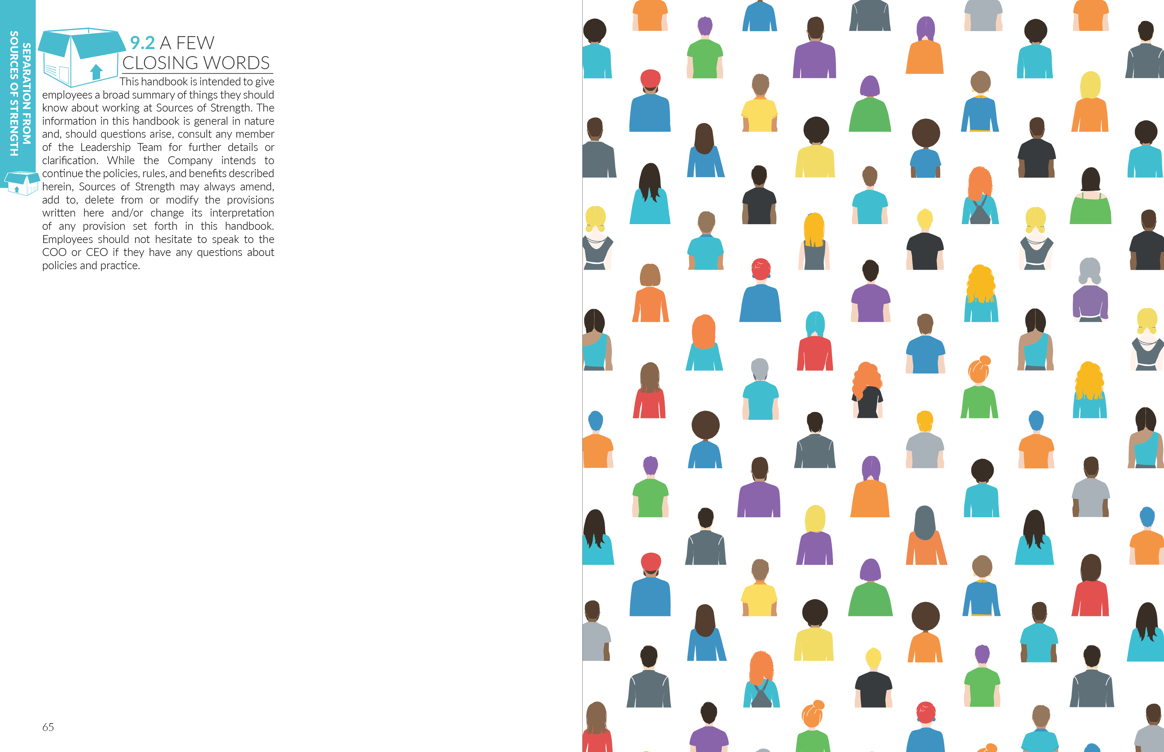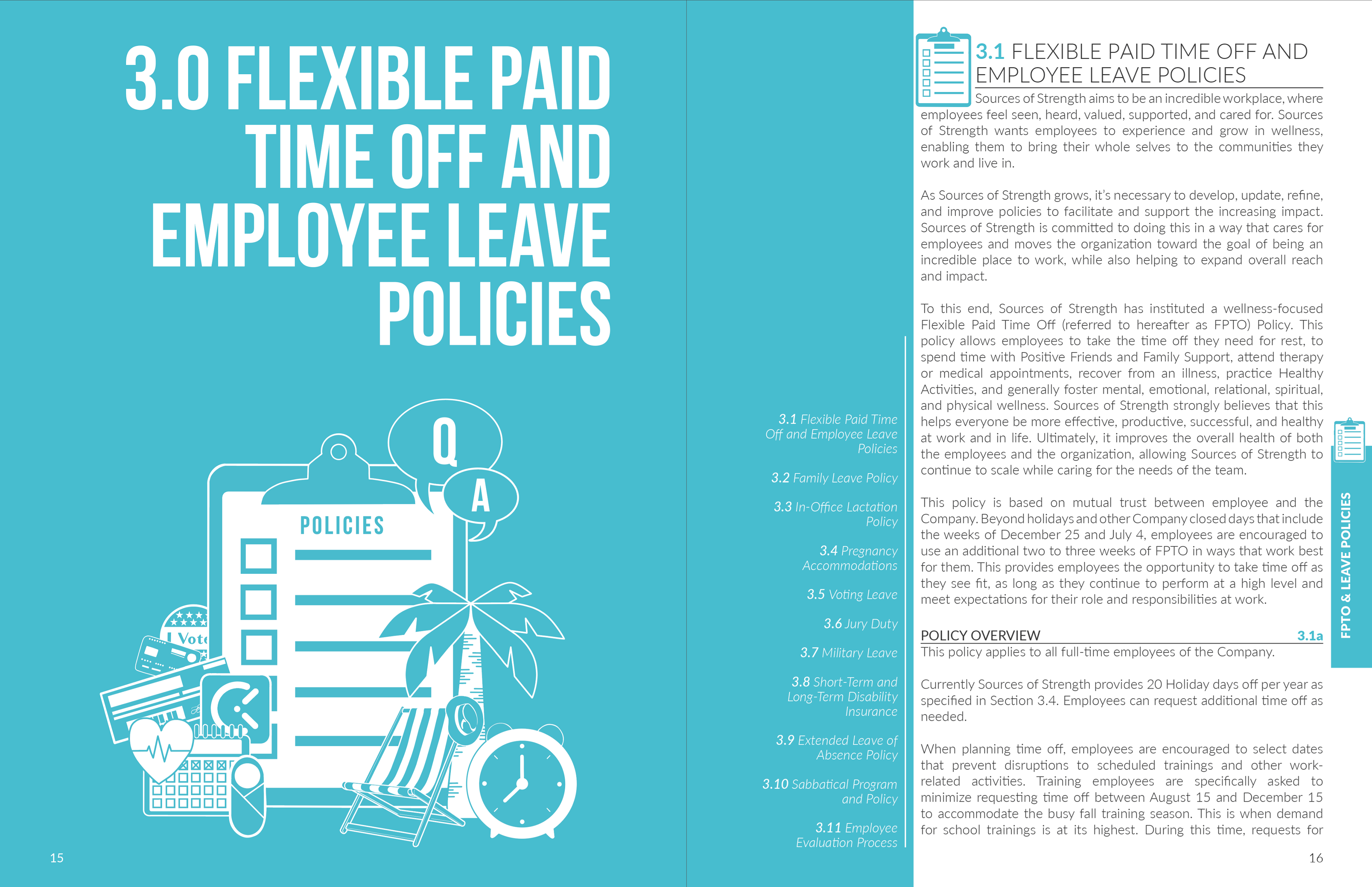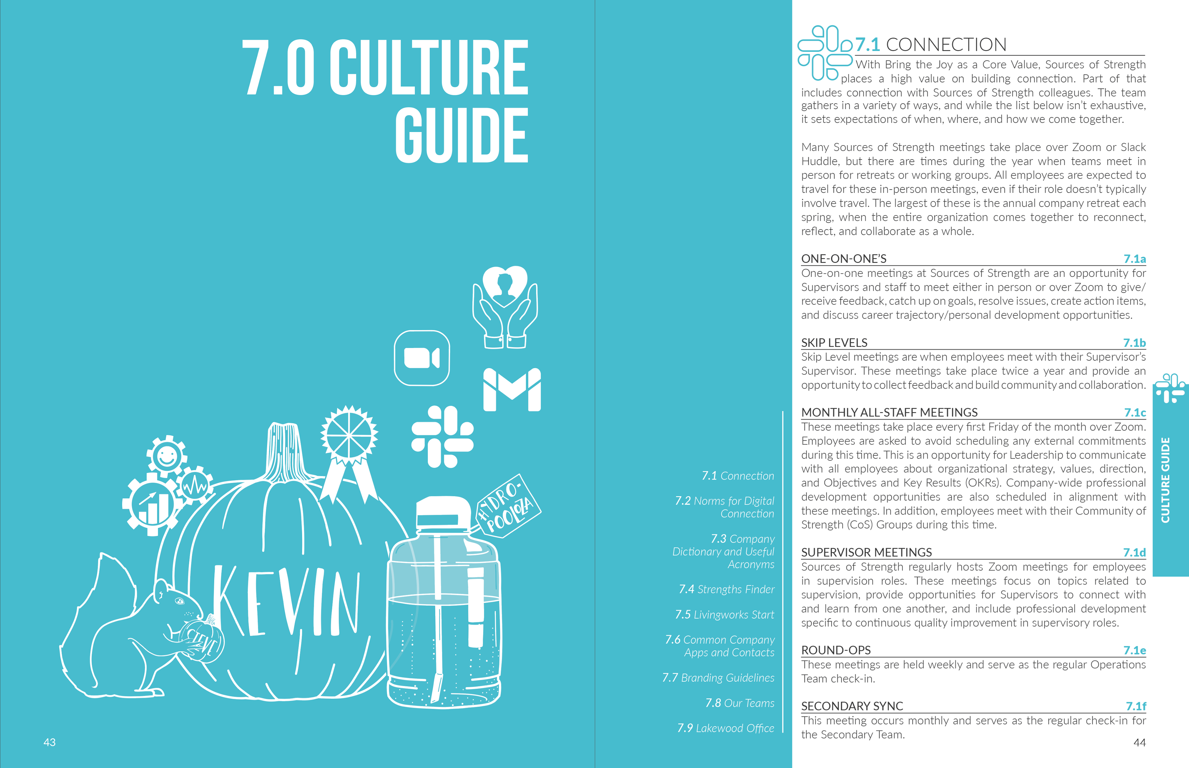 I designed and illustrated this internal company document for Employees of Sources of Strength. It is available digitally. Physical copies are also kept at the head office in Colorado. The Illustrative elements were created with Adobe Fresco (on an iPad Pro) and Adobe Illustrator. The document was created with Adobe InDesign. The written content was provided by Sources of Strength, and all materials remain their intellectual property.