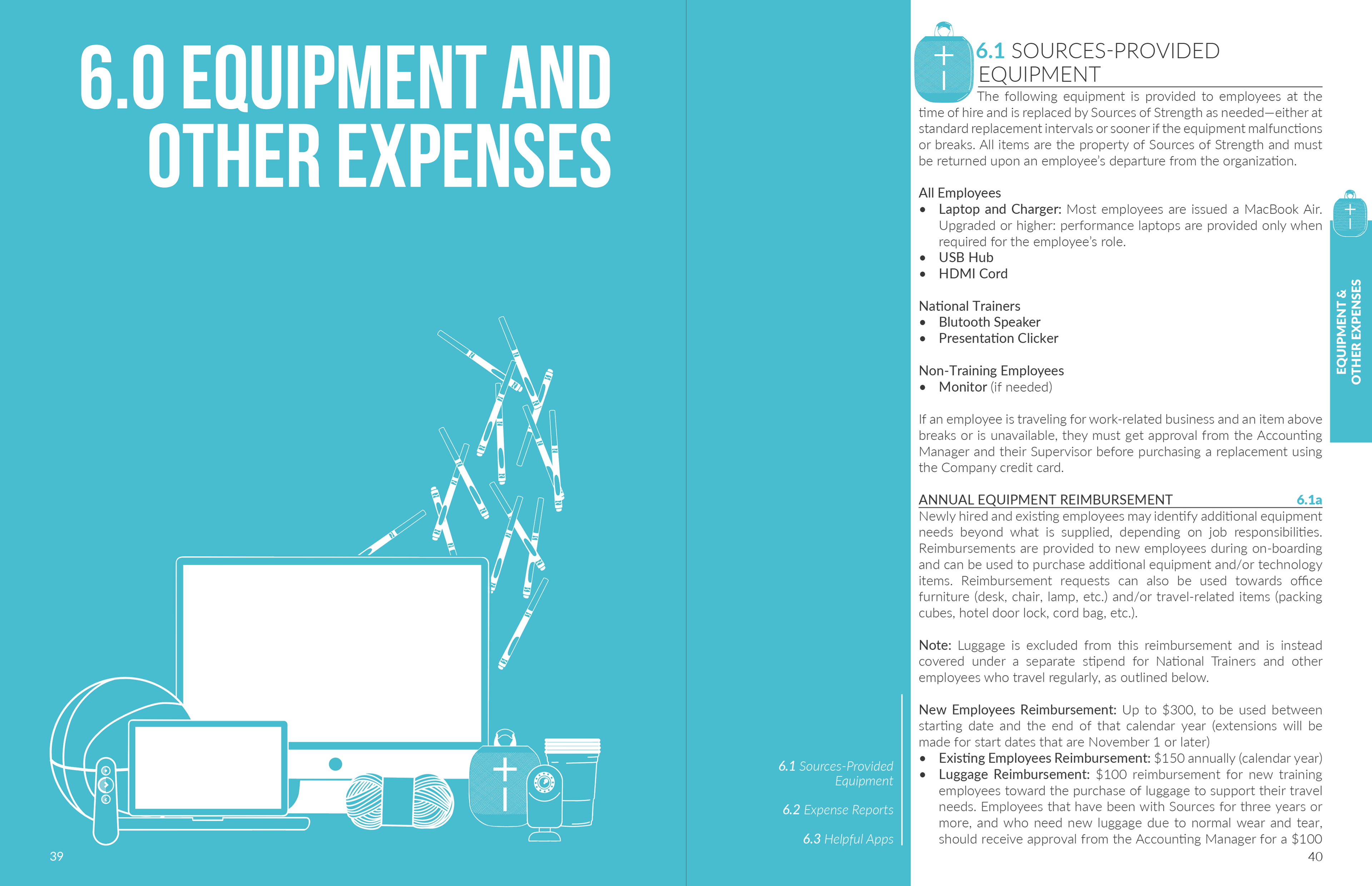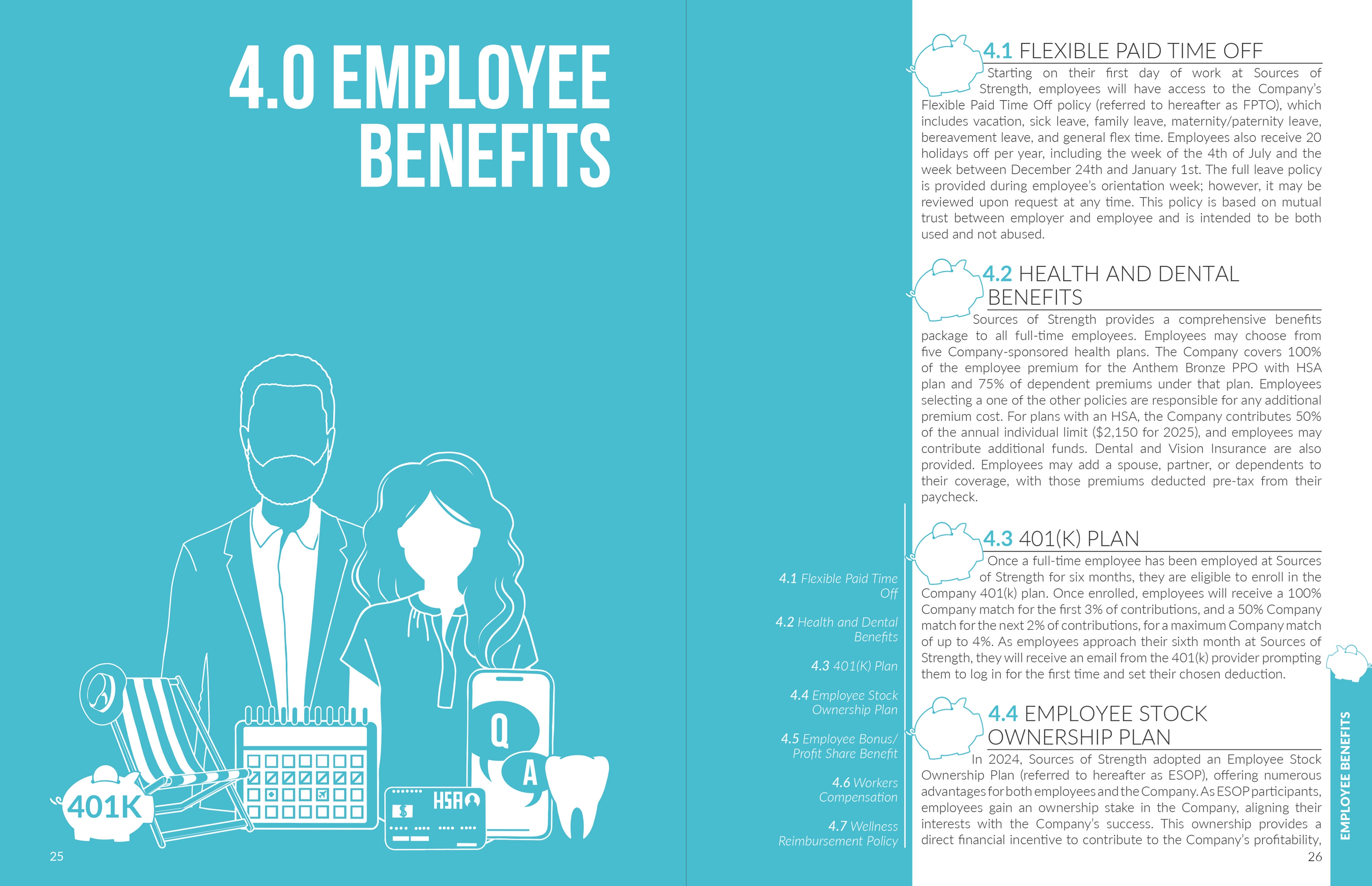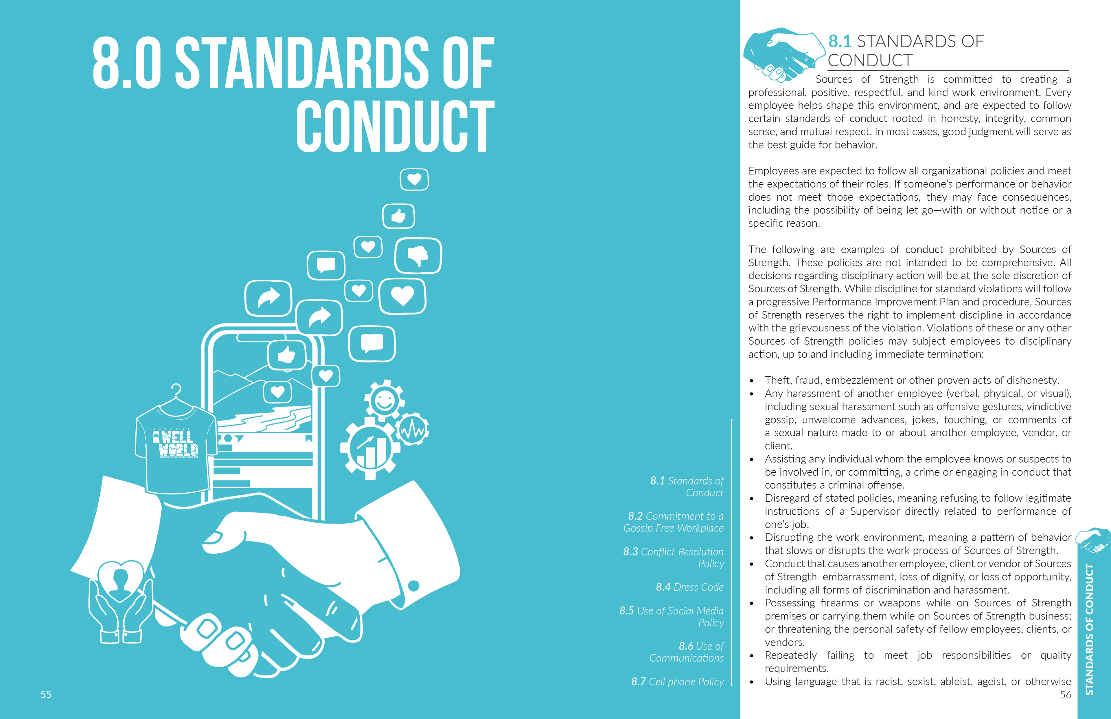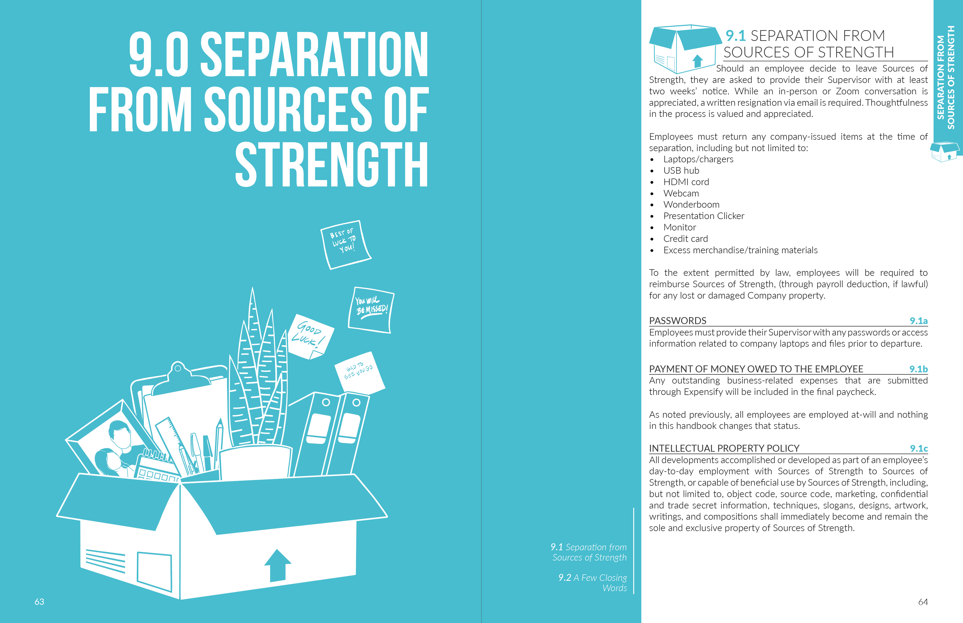 I designed and illustrated this internal company document for Employees of Sources of Strength. It is available digitally. Physical copies are also kept at the head office in Colorado. The Illustrative elements were created with Adobe Fresco (on an iPad Pro) and Adobe Illustrator. The document was created with Adobe InDesign. The written content was provided by Sources of Strength, and all materials remain their intellectual property.
